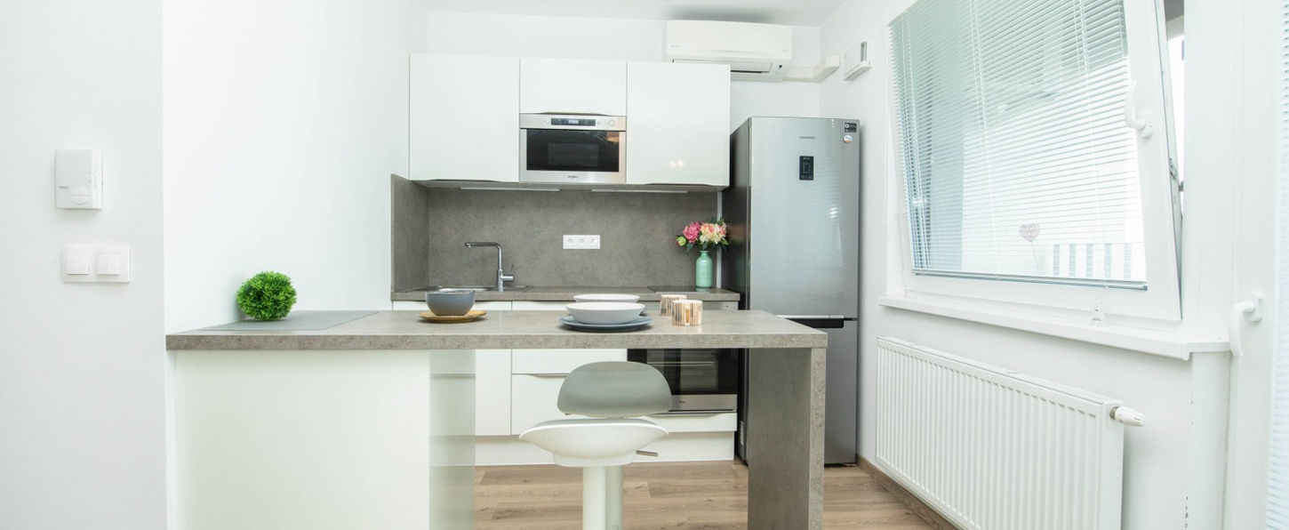 Nachádzame sa na 11. poschodí 24 podlažného bytového domu s 3 rýchlostnými výťahmi. Podlahovú plochu bytu tvorí 30,76 m2, dopĺňa ju balkón s výmerou 3,52m2 a oceľová pivničná kobka 2,4 m2. Spoločne teda budúci majiteľ dostáva 36,68 m2. Po vstupe cez bezpečnostné protipožiarne dvere sa nachádzame v predsieni so zabudovaným šatníkom, pričom po ľavej strane sa nachádza vchod do kúpeľne prepojenej s WC o výmere 4,18 m2. Kúpeľňa je ladená do príjemných nadčasových prírodných farieb, vybavená murovaným sprchovým kútom so sklenenou zástenou, umývadlom so skrinkou a zrkadlom, práčkou so susičkou (2v1). Z predsiene sa otvoreným priechodom dostávame do presvetlenej vzdušnej obytnej miestnosti prepojenej s kuchynskou a jedálenskou časťou s výmerou 22,78 m2. Vďaka veľkým oknám tiahnucim sa pozdĺž celej steny je priestor krásne presvetlený počas celého dňa a dobre vetrateľný, Príjemnú teplotu v nehnuteľnosti taktiež budúcemu maijteľovi zabezpečí klimatizačná jednotka zn. Daikin. Kuchynská linka disponuje indukčnou varnou doskou, elektrickou rúrou a mikrovlnkou zn. Whirlpool, voľnestojacou chladničkou s mrazničkou zn. Samsung. Obytná miestnosť je vybavená rozkladacou sedačkou určenou na každodenné spanie, šatníkovou skriňou a doplňujúcim nábytkom (viď foto). Prislúchajúci balkón poskytuje krásne výhľady na centrum mesta.